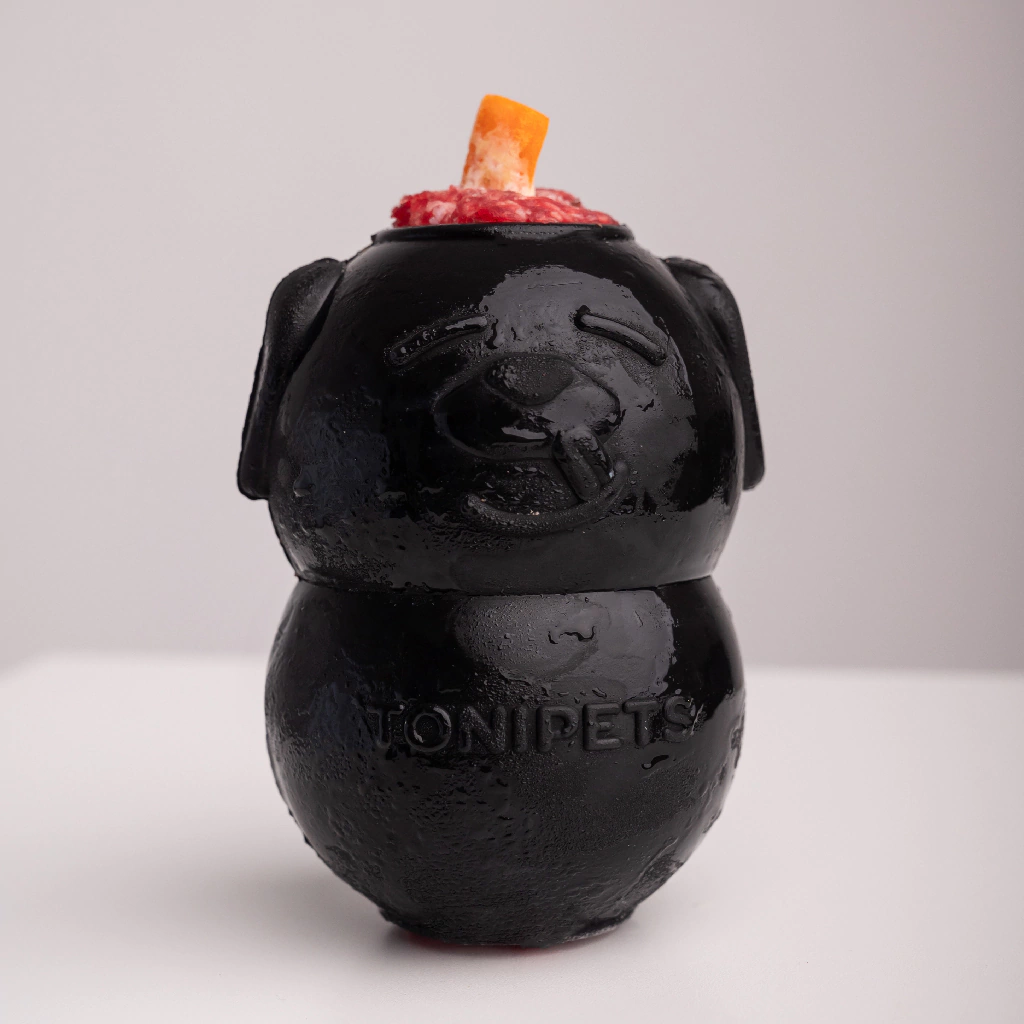 Juguete interactivo rellenable fabricado con caucho 100 % natural no tóxico + alimento natural cocido en frasco FreshBite.